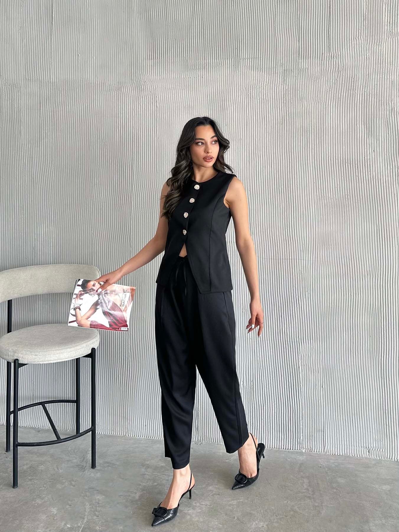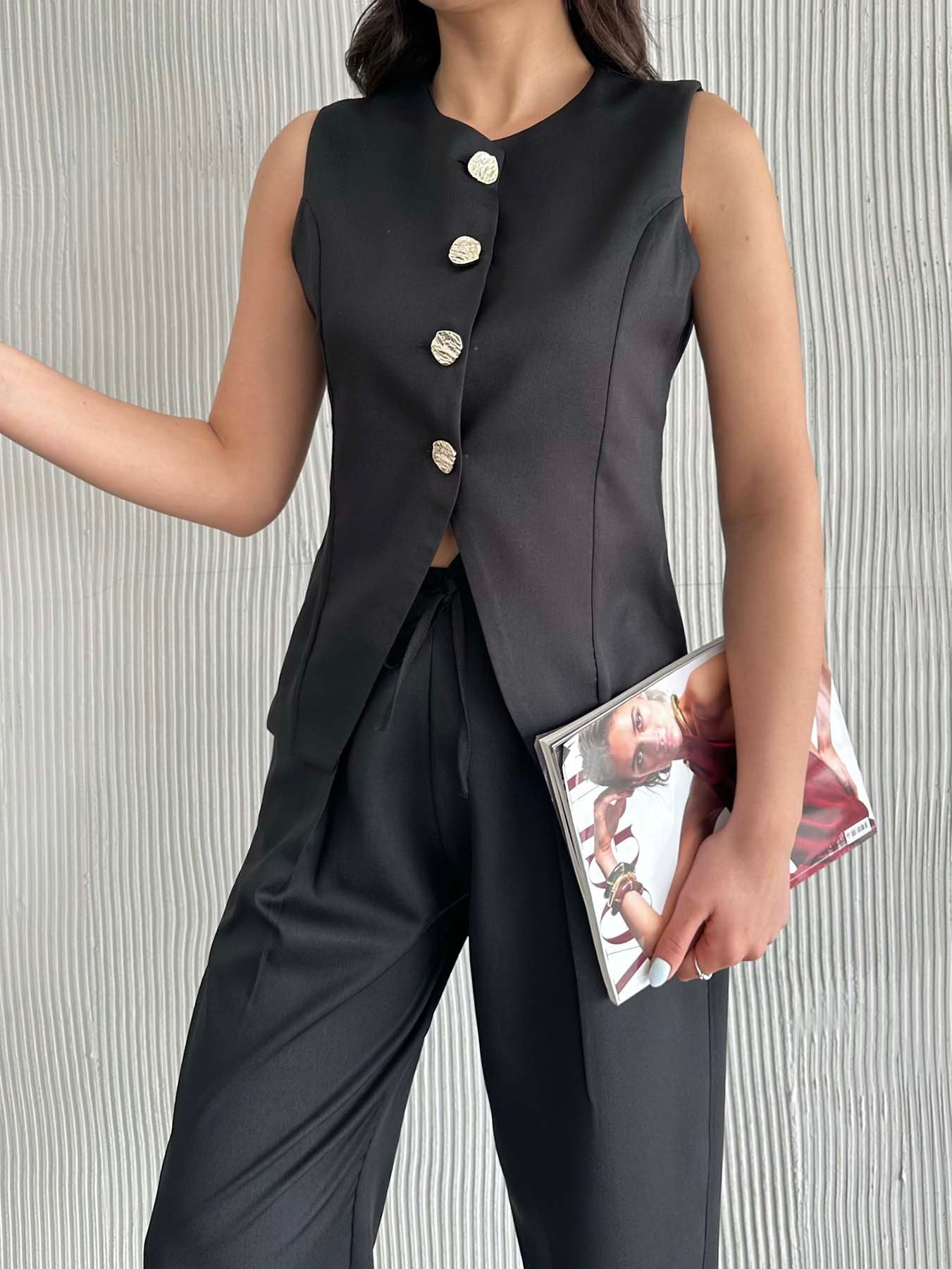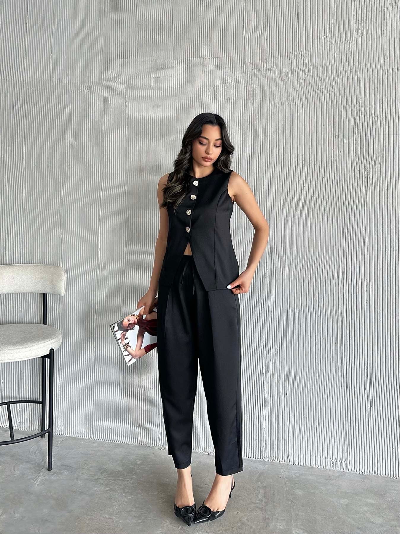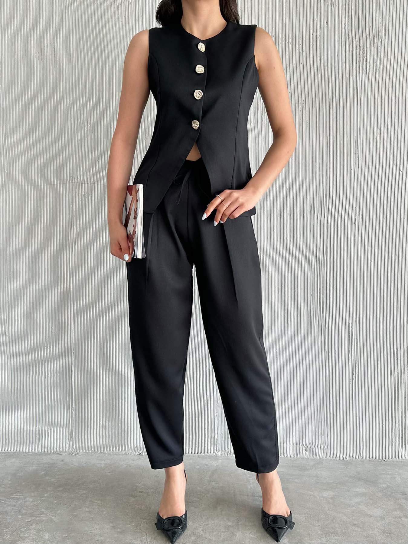 Altın Düğmeli Yelekli Pileli Pantolon Takım